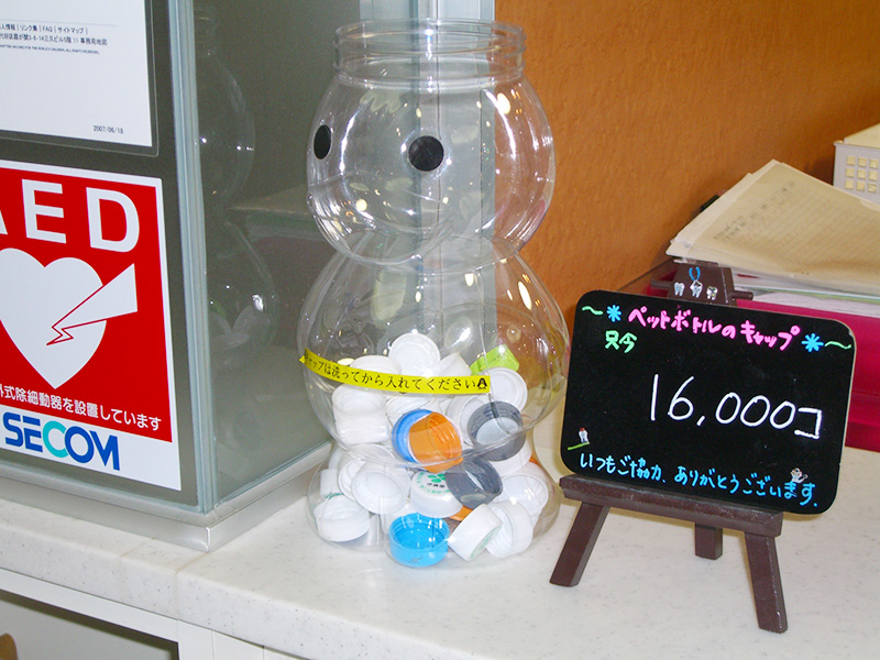 健和会歯科クリニックもこの活動に参加しています。治療に通う小さなお子さんが自分で集めたものや、主婦が家庭で貯めてくれたもの、商店主の患者さんがお店で集めてくれたものなどが診療所に届けられ、平成19年10月から平成21年2月12日までに集められたペットボトルキャップは、横浜市歯科医師会全体で6,997kg(ワクチン7,241人分)に達しました。
